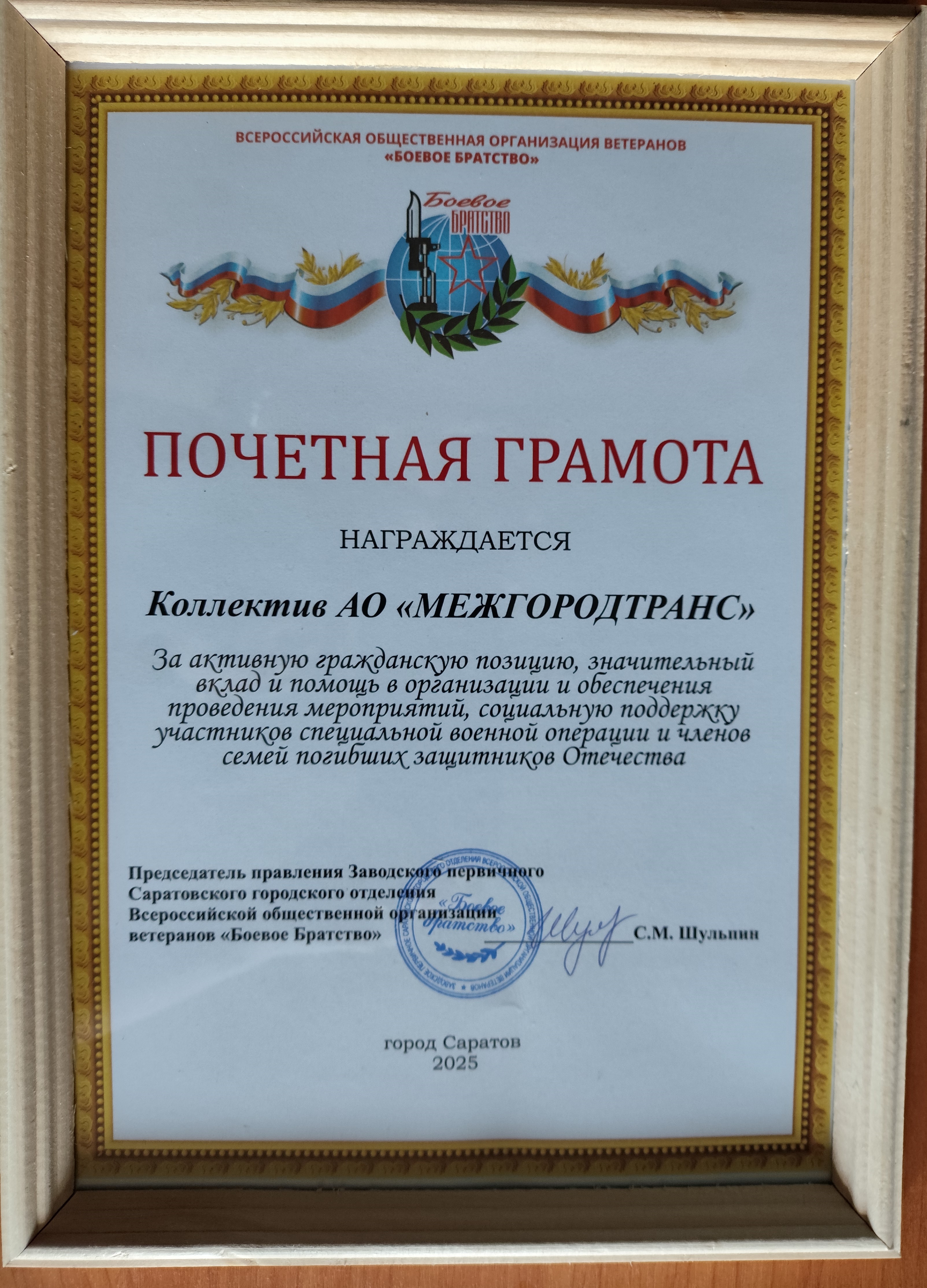 За активную гражданскую позицию, значительный вклад и помощь в организации и обеспечении проведения мероприятий, социальную поддержку участников СВО и членов их семей акционерное общество «Межгородтранс» награждено Почетной грамотой Саратовского городского отделения Всероссийской общественной организации ветеранов «Боевое Братство».
