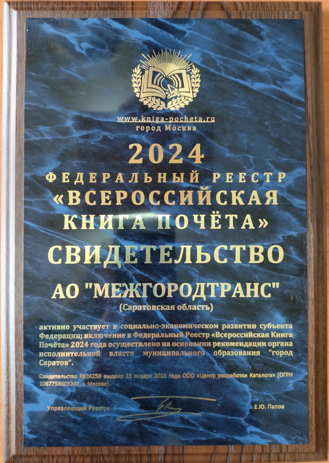 За активное участие в социально-экономическом развитии города Саратова и Саратовской области на основании рекомендации муниципального образования «Город Саратов» акционерное общество «Межгородтранс» в 2024 году включено в Федеральный Реестр «Всероссийская Книга Почета» 2024 года.