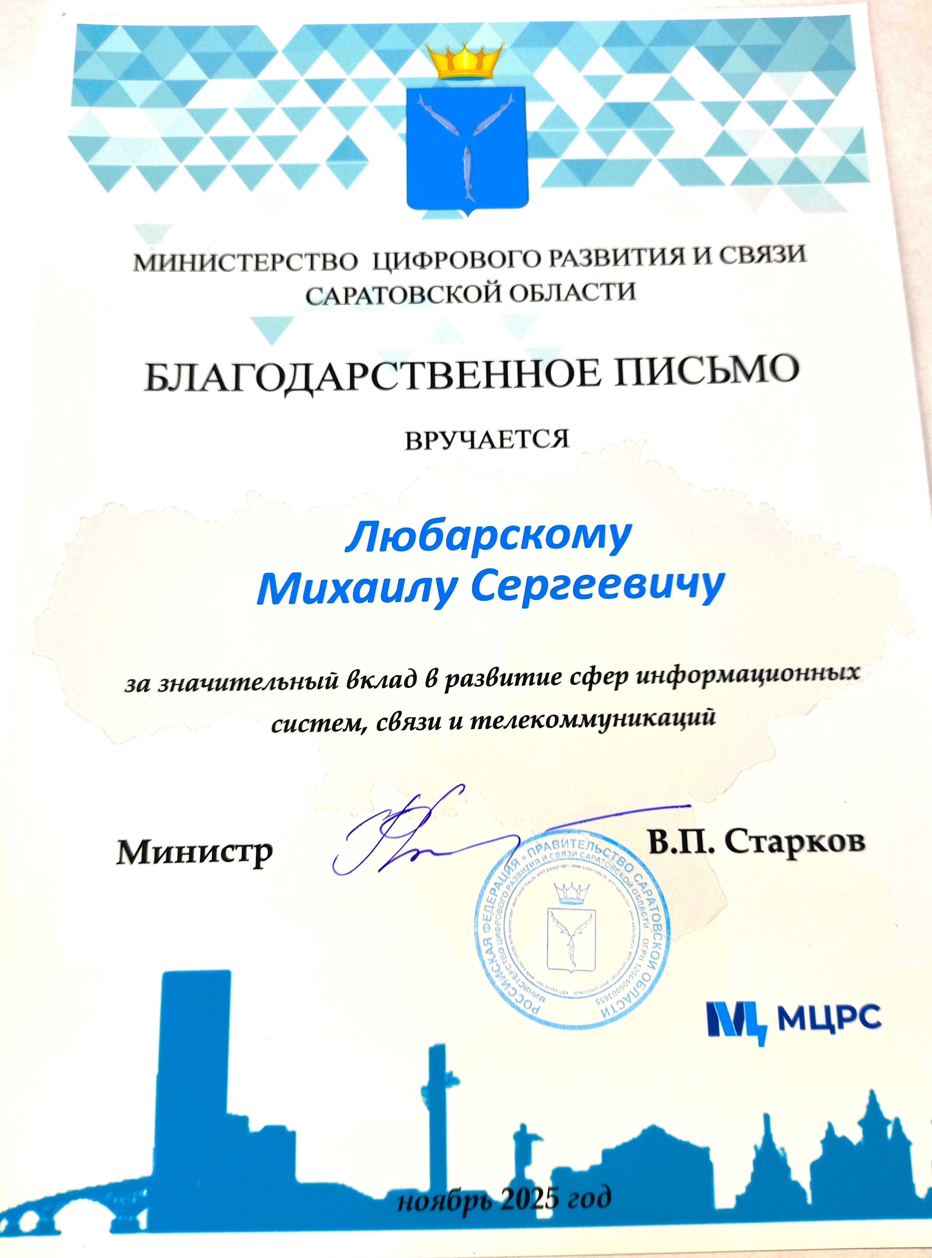 За вклад в развитие сфер информационных систем, связи и коммуникаций генеральному директору Михаилу Любарскому вручено благодарственное письмо от министра цифрового развития и связи Саратовской области Владимира Старкова.